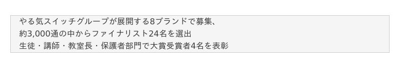 「お子さまの成長のために昨年1年間を振り返る機会として実施しているやる気スイッチ大賞は、今年で4回目を迎えました。お子さまだけでなく、保護者や講師の方々からも『お子さまをサポートした1年をやる気スイッチ大賞を通して振り返ることで、さまざまな気づきや学びがあった』という嬉しい声をいただいております。やる気スイッチグループはこれからも学ぶ楽しみや成長する喜びを味わっていただける環境を提供してまいります。」