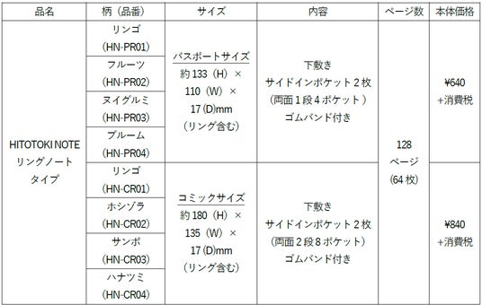 従来からあるソフトカバータイプ、ラウンドジップタイプに加え、今回新たに使用シーンを問わず気軽に使えるリングノートタイプを追加します。特長として、中身が落ちにくいサイドインポケットが付いており、デコグッズや紙ものを収納することができます。他にも、従来の「HITOTOKI NOTE」と同じ裏抜けしづらい白い紙を採用しており、ペンやシールが使いやすいしっかりとした厚みがあります。日付欄はブランクになっていて、日付のほか、天気や気分などを自由に書きこむことができます。また、定規や栞にもなる下敷きが付いています。ラインアップはサイズが「パスポートサイズ」と「コミックサイズ」、デザインは各4種類で合計8種類です。