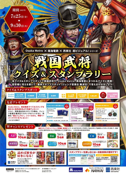 大阪市高速電気軌道株式会社(以下「Osaka Metro」)、南海電気鉄道株式会社(以下「南海電鉄」)、株式会社西東社(以下「西東社」)は、3社のコラボ企画として、「電車で巡る!戦国武将クイズ&スタンプラリー」を開催します。本スタンプラリーは、西東社が出版するかっこいい人物イラストとわかりやすい解説で人気の歴史学習本「超ビジュアル!」シリーズとコラボレーションして実施するもので、2025年7月25日(金曜日)から9月30日(火曜日)まで開催します。