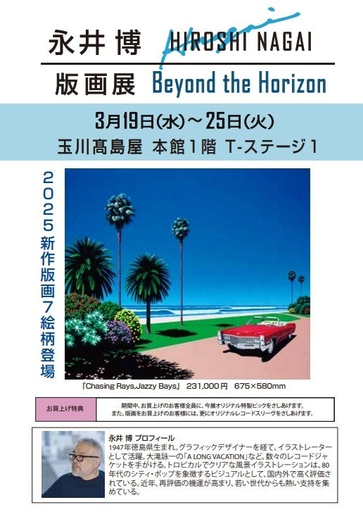 【玉川高島屋 本館1階 T-ステージ1】『永井博 版画展 2025 -Beyond the Horizon -』3/19(水)~開催中。グラフィックなリズム。真っ青な水平線の先に、大人の冒険が始まる。
