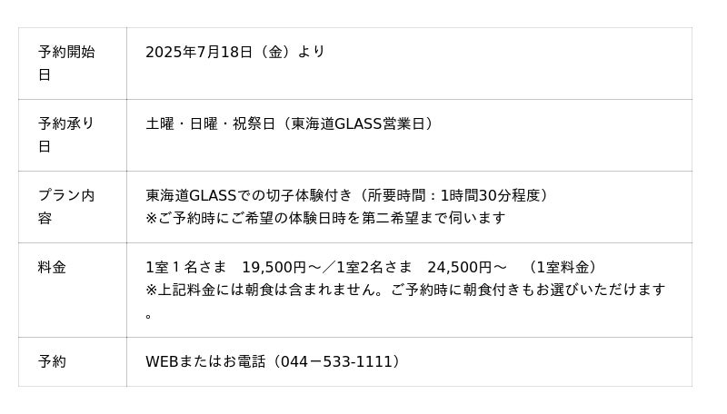 「東海道GLASS 切子体験付き宿泊プラン」 概要