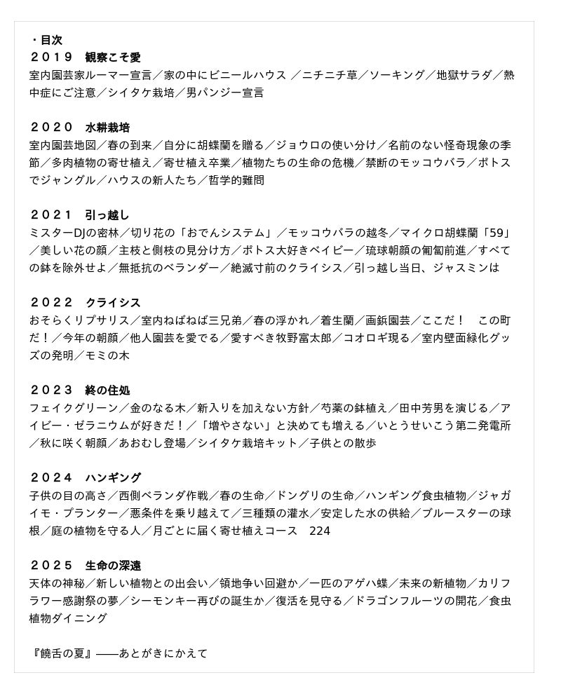 ベランダ園芸歴25年のいとう家では、昨今の気候変動もあいまって、ベランダ園芸から室内園芸にシフトしつつある日々。多少の採光があると気づけば、玄関にもサッシ窓の内側にも鉢を置き、リビングに鎮座させている組み立て式ビニールハウスの中では多肉植物を育て、壁にはエアプランツをぶら下げる。挙げ句の果てに自分に胡蝶蘭を贈るという前代未聞の行為にまで……。『ボタニカル・ライフ』から25年、『自己流園芸ベランダ派』から12年、ベランダ園芸家改め室内園芸家による愛溢るるドラマティックな植物生活の記録。笑ったり、しんみりしたり、生命の深淵さに慄いたりーー東京新聞の人気連載7年間分の書籍化。