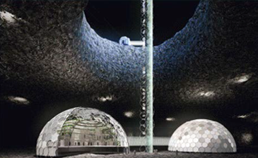 単体の滞在モジュールが完成したのちには、 月面のまちづくりが始まります。円形フレームを組み合わせた鉛直構造物(ルナタワ ー)を構築し、 長期居住のためのインフラとします。 また、クレーターや縦孔の中には滞在拠点・研究拠点となる大型空間(ルナドーム)をつくり、 安全に活動ができるようになります。