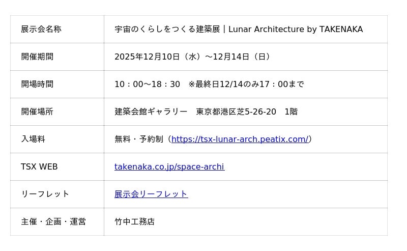 竹中工務店は、12月10日(水)~14日(日)に、「宇宙のくらしをつくる建築展|Lunar Architecture by TAKENAKA」展を、建築会館ギャラリーにて開催いたします。