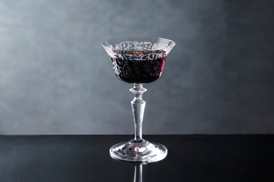 ブランデー、スミレリキュール、桜リキュールにブルーキュラソーを加え、深い黒色に仕上げています。この黒色とグラスの文様は、ビアズリーの作風をイメージしています。ブランデーをベースにしっかりとしたお酒の味わいを活かしつつ、スミレと桜リキュールの香りを加えて“妖艶さ”や“狂気”、そして“愛”を表現しています。