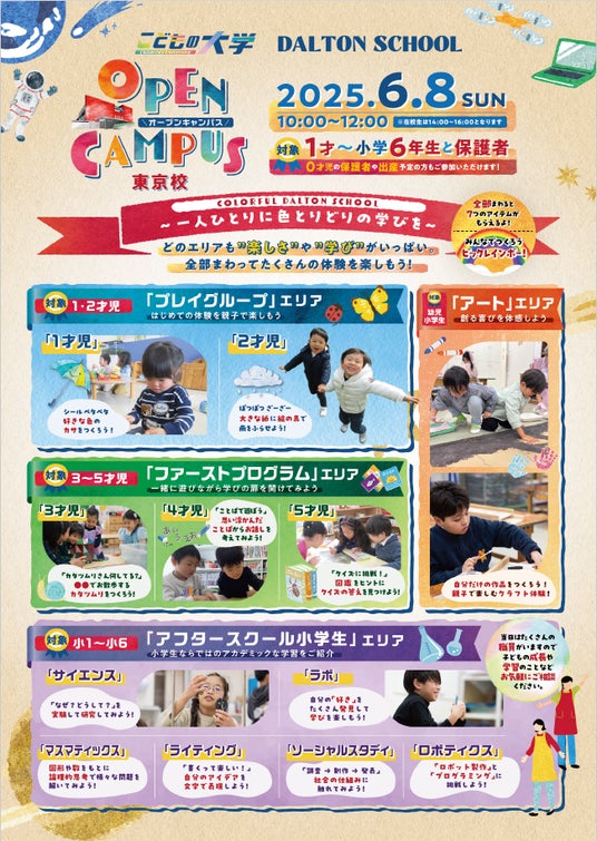 幼児・児童教育を行う河合塾グループのドルトンスクール東京校は、1才児~小学6年生とそのご家族を対象にしたオープンキャンパスを6月8日(日)に開催します。学齢、学年ごとのブースをまわり色とりどりのアイテム集めを楽しみながら、ドルトンスクールが大切にする「学ぶ楽しさ」、「創る喜び」を体感できる1日完結の体験型イベントです。