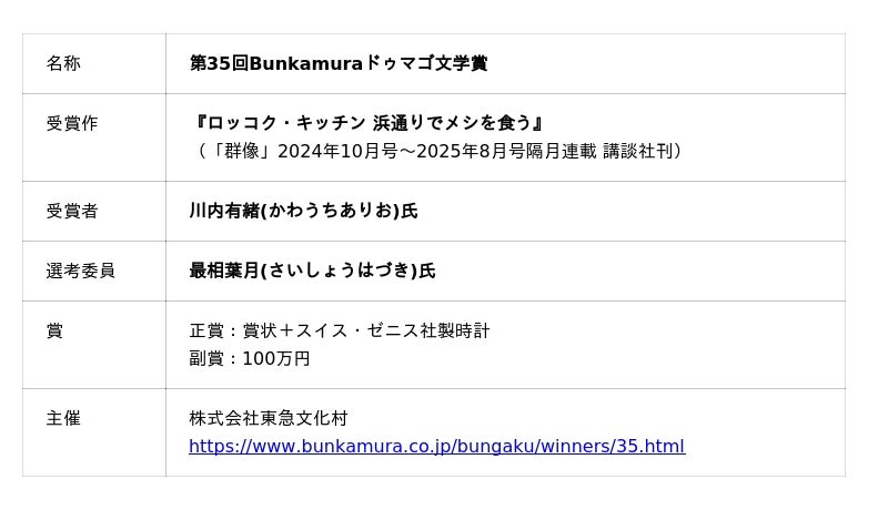 第35回(2025年度)Bunkamuraドゥマゴ文学賞が、最相葉月氏の選考により、川内有緒氏『ロッコク・キッチン』に決定しました。