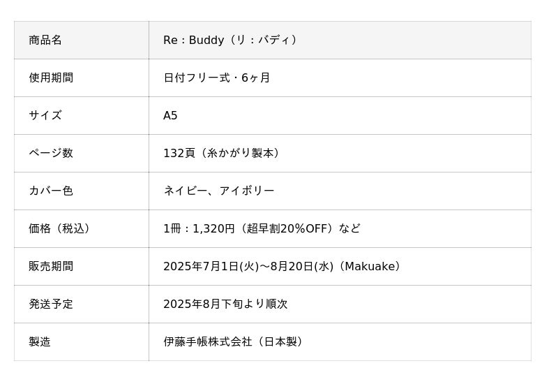 手帳製造・OEMを手がけて88年の伊藤手帳株式会社(本社名古屋市:代表取締役社長 伊藤 亮仁 以下当社)は、応援購入サービス「Makuake(マクアケ)」にて、2025年7月1日より新作手帳「Re:Buddy(リ:バディ)」の先行販売を開始し、25時間後に目標金額を達成しました!