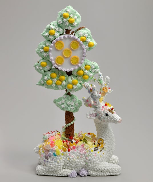 そうした記憶をもとに、本展では“お菓子の神様”と名付けた鹿の立体作品を発表します。キャンディやクリームで装飾された神聖で可笑しみのある姿は、子ども時代の驚きと憧れをそのまま形にしたものです。