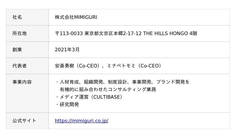 MIMIGURIは、文部科学省認定の研究機関として、組織の創造性を賦活する最新理論を実践し、社会の変革を促す経営コンサルティングファームです。デザイナー、ファシリテーター、エンジニア、コンサルタント、研究者など多様な専門家が連携し、人材育成、組織開発、制度設計、事業開発、ブランド開発を有機的に組み合わせたコンサルティングサービスを提供しています。さらに、人と組織の総合知を発信する探究メディア「CULTIBASE」の運営にも取り組んでいます。