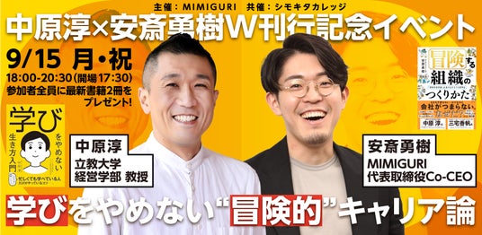 株式会社MIMIGURI(本社:東京都文京区、代表取締役Co-CEO:安斎勇樹・ミナベトモミ)は、立教大学経営学部教授の中原淳氏の新刊『学びをやめない生き方入門』(テオリア/フォレスト出版)と、弊社代表取締役Co-CEO 安斎勇樹の著書『冒険する組織のつくりかた』の刊行を記念し、2025年9月15日(月・祝)にSHIMOKITA COLLEGE(シモキタカレッジ)にてトークイベント「学びをやめない“冒険的”キャリア論」を開催いたします。