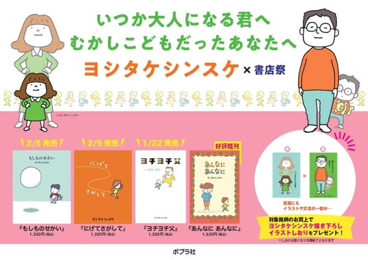 第1弾「私のための『家族の本』」、第2弾「私のための『私の本』」をテーマに、『ヨチヨチ父』『にげて さがして』『もしものせかい』『あんなに あんなに』の4作品を中心に店頭フェアが開催されます。フェア対象商品ご購入者限定特典で素敵なプレゼントがもらえるキャンペーンも!