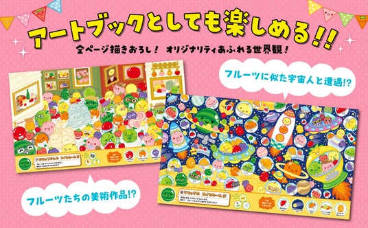 『スイカゲームをさがせ!』は、Aladdin X株式会社がリリースした累計1,100万ダウンロード超えの大人気ゲーム「スイカゲーム」初となる絵本。美術館のページではフルーツたちの彫刻作品が飾ってあったり、夏祭りのページでは提灯や屋台がフルーツ仕様だったり、これらはすべて本作オリジナルイラスト! この絵本でしか見られないフルーツたちの姿も人気のひとつです。