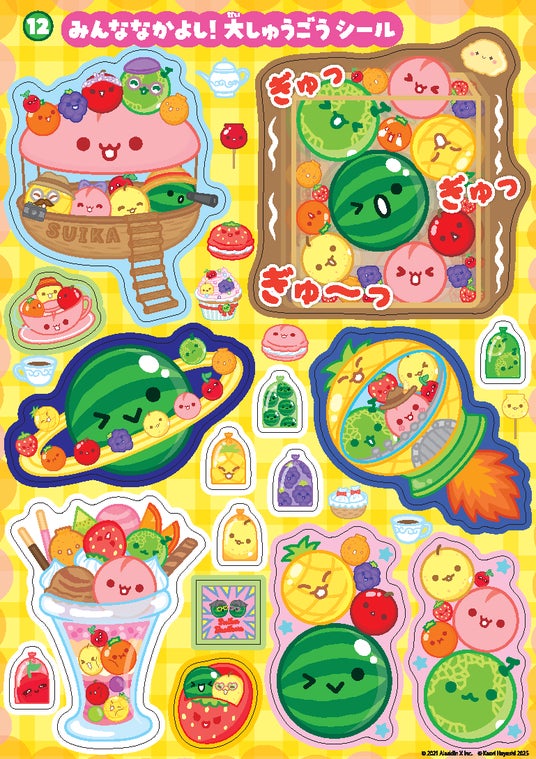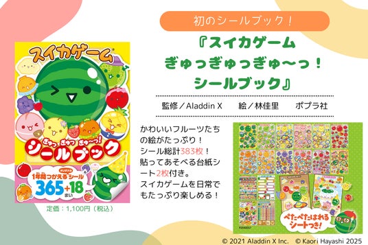 Aladdin X株式会社がリリースした累計1,100万ダウンロード超えの大人気ゲーム「スイカゲーム(R)」の初となるシールブックです。