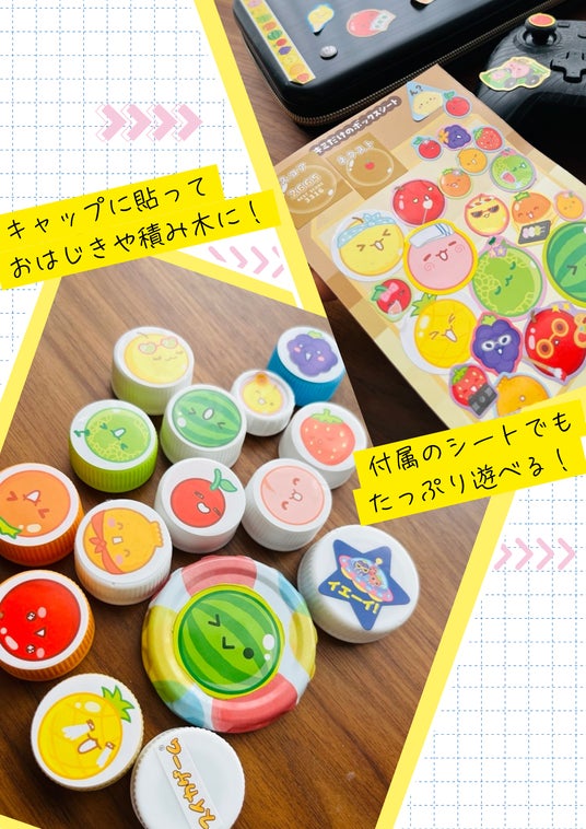 ボックスのシートもついているので、自分だけのスイカゲームを作るができます。また、ペットボトルのキャップに貼って、置物やおはじき、積み木遊びなど、いろんな遊び方で親子で楽しんでいただけます。