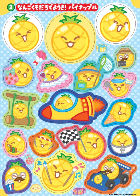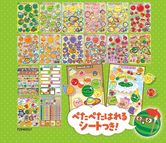 スイカゲーム初となるシールブック。フルーツたちのいろんな表情がつまった383枚のオリジナルシールに加え、あの“ボックス”とパーティー仕様の台紙シートが2枚ついています。いろいろなところに貼って、フルーツたちと素敵な毎日を過ごしましょう。