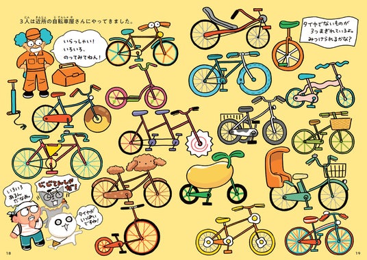 ピザねこのお話ともう1話収録されている「おまちど・うどん!出前です」では、うどんねことともに人気のそばねこが自転車をさがすシーンも! よく見ると、タイヤじゃないものが混ざっているようです。