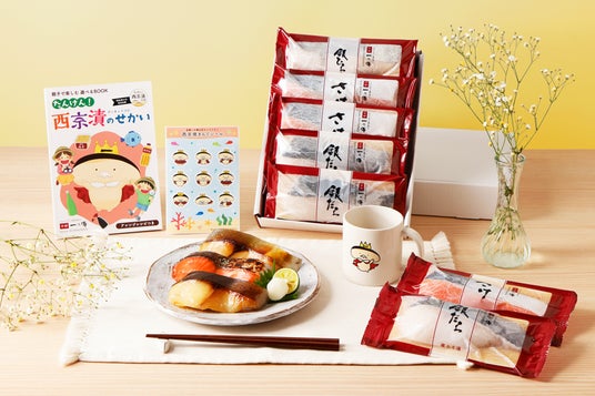 お取り寄せページのほか、対象期間中に、京都一の傳 本店・ジェイアール京都伊勢丹B1店で「『西京漬の日』記念セット5切入」をご購入、もしくは、京都一の傳 本店2階のお食事処でお子様ランチをご注文の方に記念BOOKとシールをプレゼントいたします。