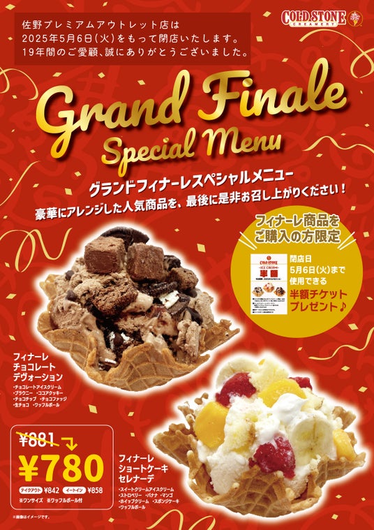 【 コールド・ストーン・クリーマリー 佐野プレミアム・アウトレット店 “閉店キャンペーン“ 実施 】感謝を込めて、“グランドフィナーレ スペシャルメニュー“ を、4/7(月)より販売開始!