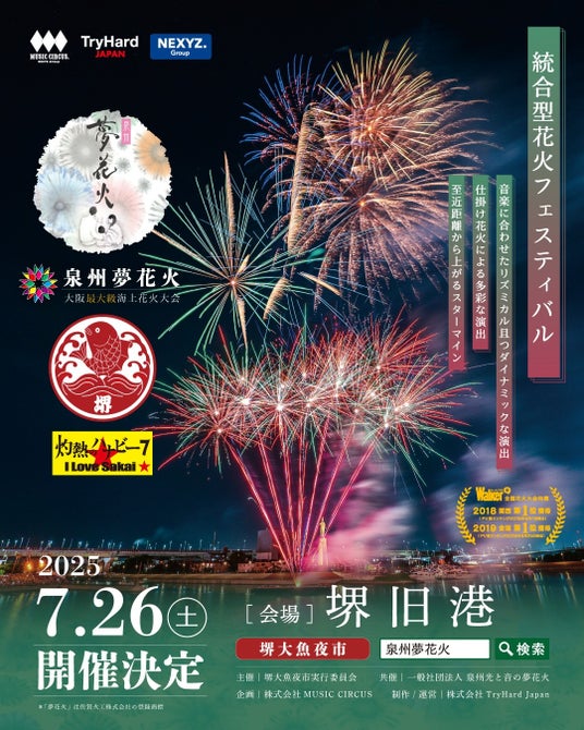 株式会社TryHard Japan(大阪市中央区)は、堺市・大浜公園で開催された「堺大魚夜市(さかいおおうおよいち)」とのコラボレーション企画として、2025年7月26日(土)に「泉州夢花火 in 堺大魚夜市」を堺旧港にて開催いたしました。
