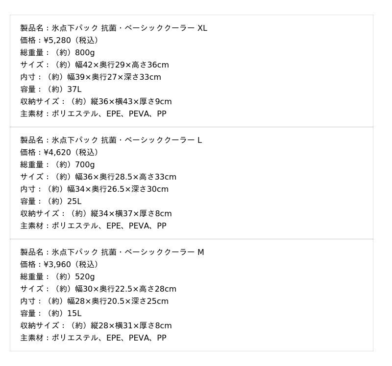 様々なシーンで使える、XLサイズ(37L)、Lサイズ(25L)、Mサイズ(15L)の3サイズを展開。内側蓋部分には、別売りの超強力保冷剤「氷点下パック(R)」が入るポケット付き。セットして使えば保冷力がさらにアップ。内側生地には安心の抗菌加工を施しており、保存時の衛生面をキレイに保つ。