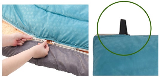 また、寝袋の内側と外側どちらからでも開閉ができる「ダブルフェイスジップトップ」と、フレキシブルな温度調節が可能な「ダブルファスナー」を採用しています。さらに、大型の洗濯機で丸洗いも可能なので、いつでも快適で清潔な睡眠を実現します。陰干しの際に便利な「ハンガーループ」付きです。