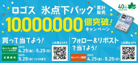 株式会社ロゴスコーポレーション(本社:大阪市住之江区、代表取締役社長:柴田茂樹)が展開するアウトドアブランドの「LOGOS」は、ブランド40周年と、ロングセラー製品である強力保冷剤「氷点下パック(R)」の累計販売数10,000,000個突破を記念し、『氷点下パック(R)累計販売10,000,000個突破!キャンペーン』を2025年4月25日(金)から5月25日(日)まで実施いたします。