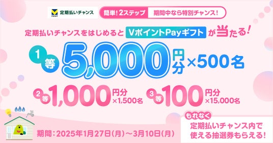 三井住友カード株式会社(本社:東京都江東区、代表取締役社長:大西 幸彦、以下:三井住友カード)が提供する、公共料金やサブスクリプションサービス利用料の管理が便利になるサービス、「定期払いチャンス」。2025年1月27日(月)より、定期払いチャンスをまだ始めていない方を対象に、「『定期払いチャンス』をはじめよう!最大5,000円分のVポイントPayギフトが当たる!キャンペーン」を開始します。
