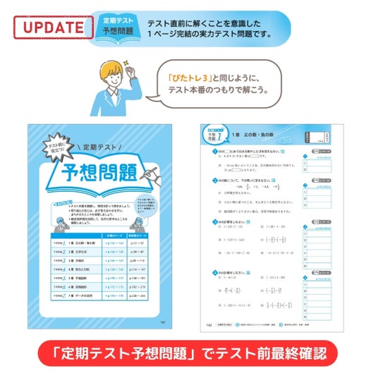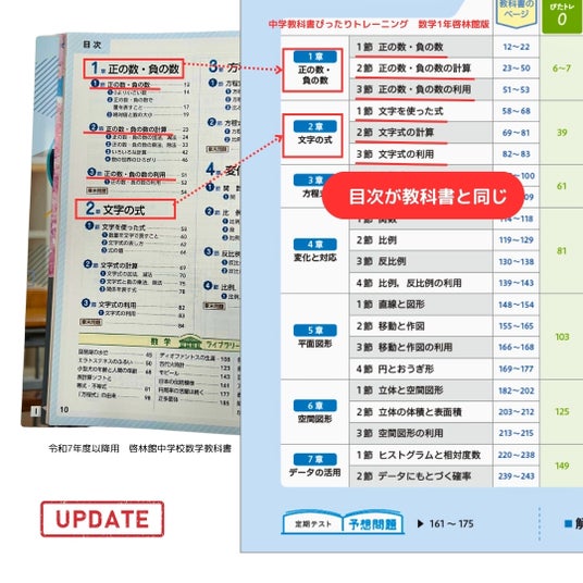 教科書が改訂されると、もくじ(学習順)や用語が変更になったりすることがあります。教科書に完全対応した「教科書ぴったりトレーニング」なら、学習順や内容で迷うことはありません。そのまま予習・復習・テスト対策に使うことができます。