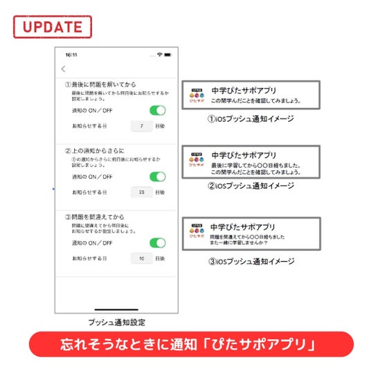 9教科1問1答と中学校で学習する英単語2000を学べる「ぴたサポアプリ」がアップデート。「最後に問題を解いた日から〇日目に通知」「問題を間違えてから〇日目に通知」といった忘却防止の仕組みを新規装備