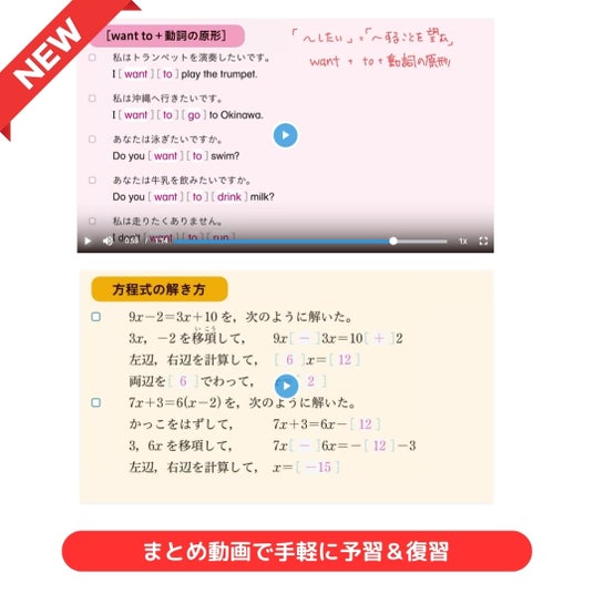 忙しい中学生のために、短時間で学習内容のポイントがわかる「まとめ動画」を用意しました(5教科)。動画は4月から順次公開予定です。