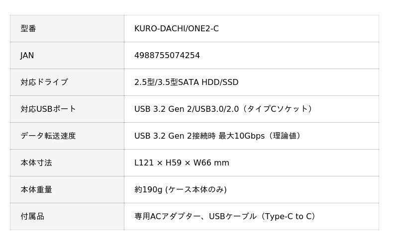 KURO-DACHI/ONE2-C | 玄人志向 USB3.2 Gen2 接続 3.5/2.5型 SATA SSD/HDD スタンド