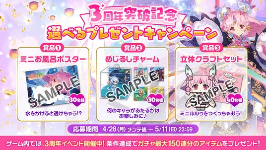 3周年を記念して、「ミニお風呂ポスター」や「めじるしチャーム」などが合計100名に当たるプレゼントキャンペーンも開催!