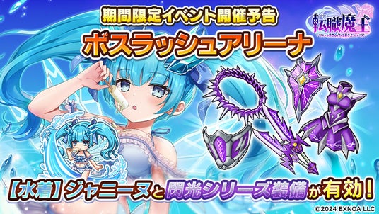 次々と現れる強力なボスを討伐し、豪華報酬を目指すイベント「ボスラッシュアリーナ」の初開催が決定いたしました。今回は水属性が有利なボスが登場! 新キャラクター「LR【水着】ジャニーヌ」は特効キャラクターとして、イベントを有利に進めることができます。 イベント限定の称号やフレームを手に入れましょう!