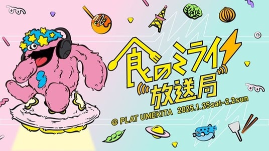 本企画展は、うめきた公園を利用する人々に、公園の過ごし方や日々の暮らしを遊びながらアップデートする体験を提供する「PLAT UMEKITA」が、自主企画展として定期的に開催する「あたらしい価値観を楽しい体験に変換する=エシカルテインメント(※)」の第二弾です。今回は「PLAT UMEKITA」が「食のミライ」をテーマにした「体験型放送局」となり、トーク、ライブ、体験型の展示やワークショップ、そして未来の食材を実際に食べることができるマルシェを行います。食べることが好きな宇宙人がナビゲーター役となり、「食べる」の今と未来を、遊びながら知ることができるイベントです。