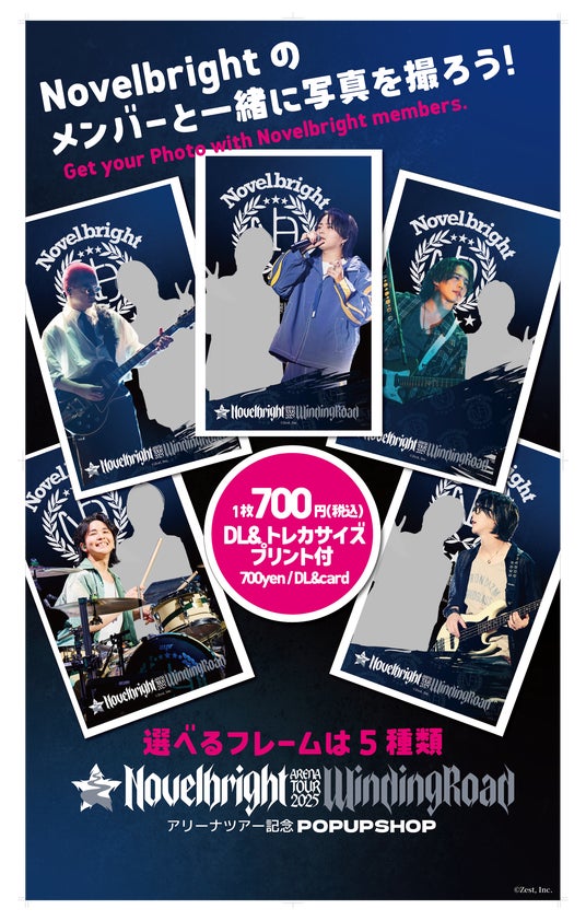 「Novelbright」は、Vo.竹中雄大、Gt.山田海斗、Gt.沖聡次郎、Ba.圭吾、Dr.ねぎによる大阪発5人組ロックバンドで、2020年8月17日にユニバーサル ミュージック・ユニバーサル シグマよりメジャーデビューしました。2013年にオリジナルメンバーで結成し、2019年に現体制となりました。全国を回った路上ライブツアーの様子がSNSで広くシェアされ、人気を博しました。歌声やメロディワーク、楽曲アレンジ等が高く評価されており、代表曲である「Walking with you」「ツキミソウ」「愛とか恋とか」の3曲はストリーミング総再生回数3億回を超えています。今回ショップのテーマともなっている「Novelbright ARENA TOUR 2025 ~Winding Road~」は、2025年4月より、アリーナツアーとして全国7都市で開催されています。