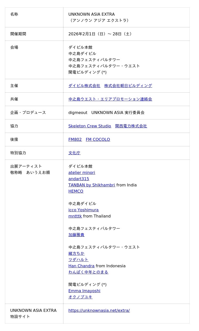 UNKNOWN ASIA実行委員会(大阪市北区)は、2026年2月1日(日)から28日(土)までの1ヶ月間、大阪・中之島エリアにてアートイベント「UNKNOWN ASIA EXTRA」を開催することを発表いたします。