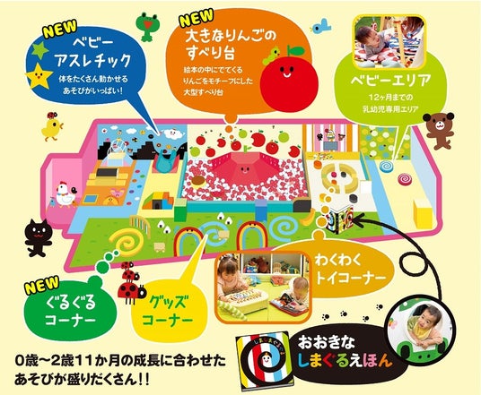これまで全国に3店舗(大阪、千葉、愛知)展開しており、4店舗目の「しまぐるランドレイクタウンmori」ではこれまでの「しまぐるランド」で最大級の面積で、小さなお子さまはもちろん、2歳のお子さまでも大きく体を動かせるエリアを拡充するなど、あそびの内容をさらに進化させています。