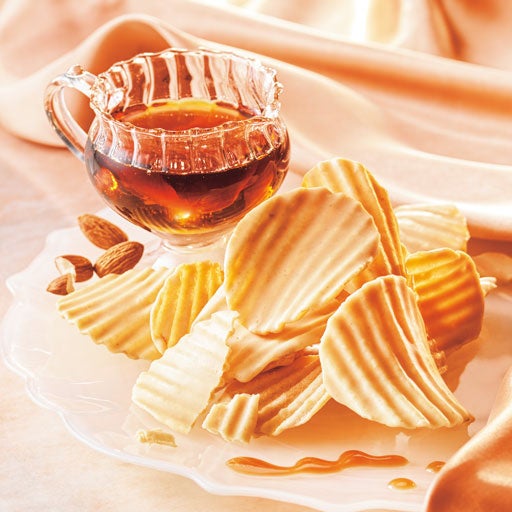 メープルシュガーとアーモンドプラリネペーストを加えたチョコレートを、ポテトチップの片面にコーティングしました。ほんのり塩味のポテトチップとやさしいメープルシュガーの風味が絶妙なバランスの、手が止まらなくなるおいしさです。後味にほんのりナッツが香ります。