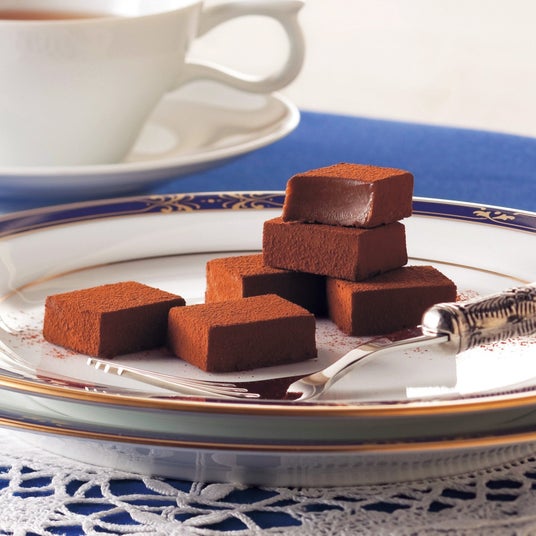 イタリアで生まれたデザート「ティラミス」をイメージした生チョコレート。マスカルポーネチーズのパウダーを入れたホワイトチョコレートのガナッシュと、コーヒーとコーヒーリキュール入りのガナッシュを2層に重ね、ココアパウダーをかけました。チーズのコクとコーヒーの味わいが、それぞれ引き立ちながらもとけ合い、まるでティラミスを食べているかのような風味が広がります。