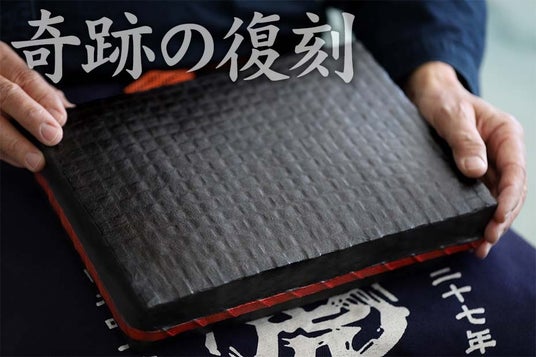 「一閑張り文庫」は、長い間倉庫で眠っていた四ツ目編み角籠を、土佐和紙と柿渋で復刻させた書類箱です。真竹の四ツ目編みの美しさを活かし、極薄の和紙を丁寧に下貼り。その上に色付き和紙を重ね、仕上げには柿渋を五回塗布しました。この手間とこだわりが、耐久性と上質な風合いを兼ね備えた逸品を生み出しました。