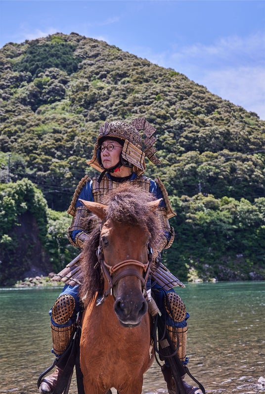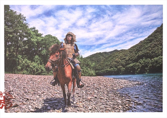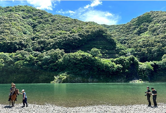 高知県四万十の自然豊かなロケーションでの写真撮影。青空と緑のコントラストが映える雄大な風景の中で、馬と竹虎四代目が一体となる様子を捉えました。シンプルながらも見応えのある構図で、見る人の記憶に残るデザインとなっています。