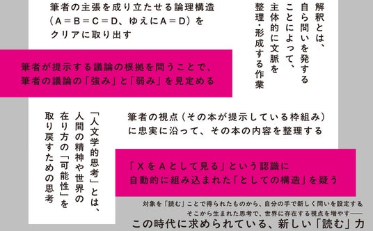 本書は、およそ学問にかかわるすべての文章の読み方、そして批判的読解力の実践の仕方まで、著者が東京大学大学院で培った技術を網羅的に提供する一冊です。