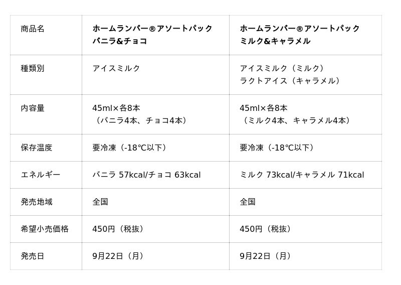 今回、新発売する『ホームランバー バニラ&チョコ』、『ホームランバー ミルク&キャラメル』は、味わいを一新し、より満足感を感じていただけるようになりました。特にバニラ&チョコはこれまでのラクトアイス規格からアイスミルク規格にグレードアップし、さらにおいしくなりました。
