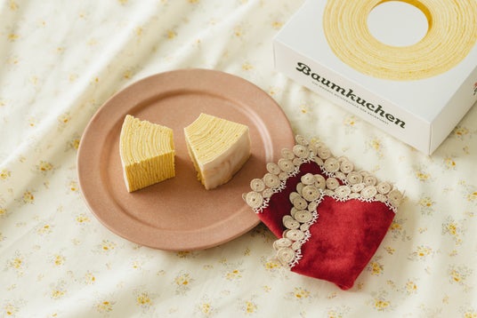 今回のタオルハンカチは、リング型のバウムクーヘンと、ユーハイムの定番「扇型」のバウムクーヘンを組み合わせた柄のレースでご用意しました。ユーハイムが日本で初めて販売したお菓子であり、一番の人気商品「バウムクーヘン」とともにセットで販売いたします。バウムクーヘンは木の年輪のように層が重なる様子や、途切れない「輪」や末広がりの「扇」の形から、お祝いや特別な日の贈り物に用いられてきたお菓子です。2025年の母の日は、5月11日(日)。幾重にも重なるバウムクーヘンの層に、お母さんへの「ありがとう」の気持ちを込めて贈りませんか。