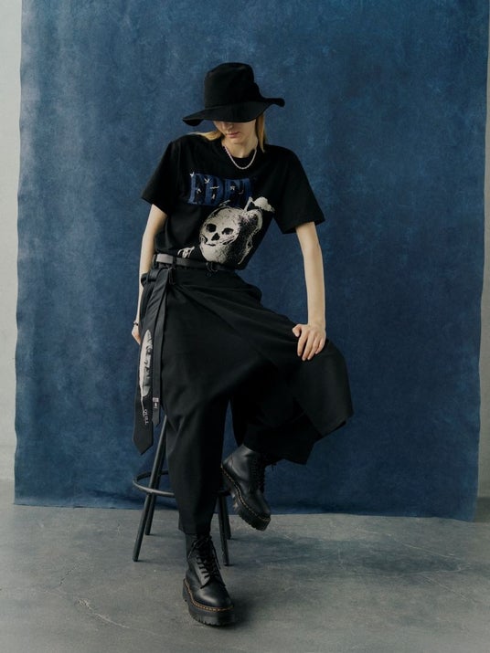 「アメリカ版浦島太郎」として知られるリップ・ヴァン・ウィンクルと、エドガー・アラン・ポーの詩 「大鴉 (オオガラス)」 を掛け合わせた、二度と戻らない時間を象徴する作品 【Rip Van Winkle】 がフロントを飾るグラフィックプルオーバー。モノトーンに色挿す胸元の赤い花が印象的。