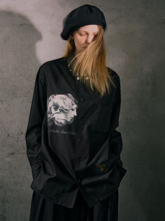 ドイツの作家、ハンス・ヘニー・ヤーンの小説を題材にした作品 【鉛の夜】 をプリントしたレギュラーカラーシャツ。鉛筆画ならではの美しい線の流れや濃淡をモノトーンプリントで表現し、胸元には作品タイトルのテキストをあしらっている。