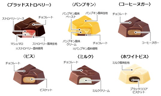 34個入り(パンプキン・ビス:各7個、コーヒーヌガー:6個、ホワイトビス・ブラッドストロベリー:各5個、ミルク:4個)