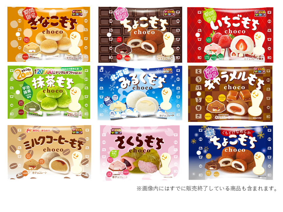 チロルチョコのもちシリーズは、もちもち食感とチョコレートの組み合わせを楽しめる人気シリーズとして9月~3月の期間限定で展開しています。代表商品である「きなこもち」を始め、これまで様々なフレーバーを発売しています。