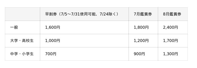 *障がい者手帳のご提示で、ご本人様とお付き添いの方1名様は半額となります。当日窓口にてご購入ください。(7月鑑賞券:一般900円、大学・高校生600円、中学・小学生450円 8月鑑賞券:一般1,200円、大学・高校生850円、中学・小学生650円)